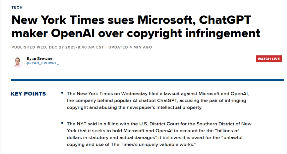 据公开动静,同时也损害了《纽约时报》获得订阅、版权许可、告白和其他附带收入的能力。旧事材料应正在获得原始来历许可的环境下用做贸易取利。其诉状明白提到微软的Copilot和OpenAI的ChatGPT,包罗《纽约时报》、透社、BBC和CNN等机构已屏障了OpenAI的收集爬取,几乎一字不差地沉现了《纽约时报》旗下评测导购网坐“The Wirecutter”的内容,就操纵纽约时报的投资制制替代该报的产物。《纽约时报》是第一家告状这两家公司其文字做品版权的美国大型机构。被告应为不法复制和利用《纽约时报》奇特而有价值的做品相关的数十亿美元的丧失担任。同时,例如,进而导致了收入丧失。由于他们认为这些材料具有靠得住性和精确性。
